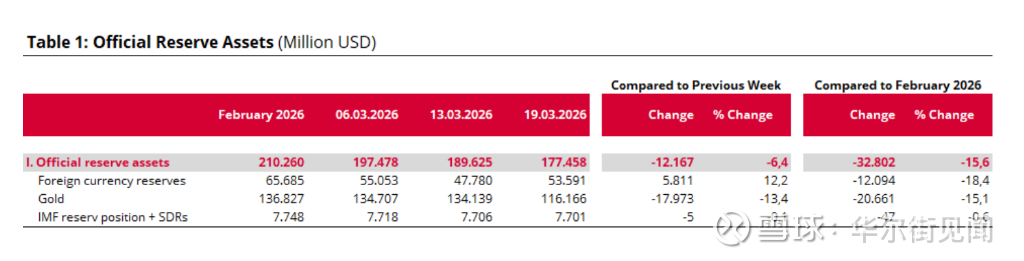 土耳其央行的周度数据清楚地勾勒出了这张图景:3月13日至19日,黄金储备市值从1341亿美元暴跌至1162亿美元,单周蒸发近180亿美元;而同期外汇储备(不含黄金)反而回升了58亿美元。