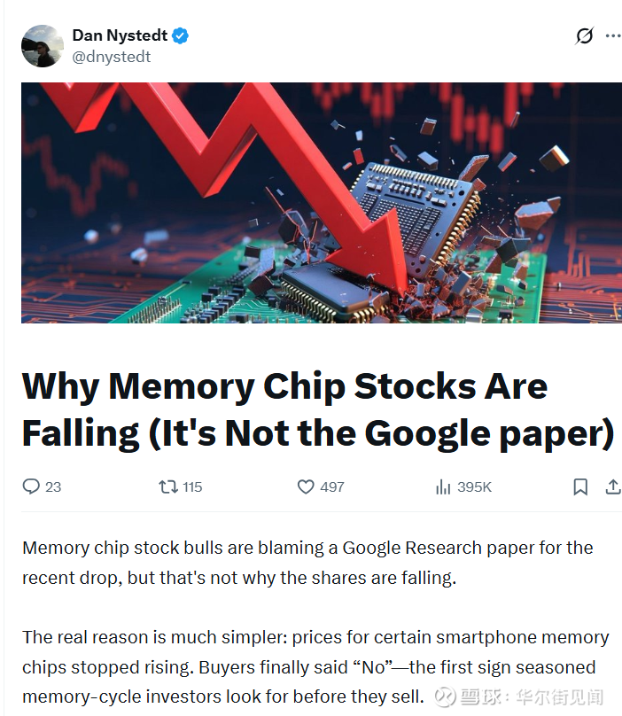 对于遵循传统周期的交易员而言,市场大跌并非那么简单。前记者、知名驻台半导体分析师Dan Nystedt指出,许多看多者将近期的暴跌归咎于谷歌的论文,但这只是表象。Dan认为真正的原因在于,部分智能手机内存芯片价格停止了上涨。