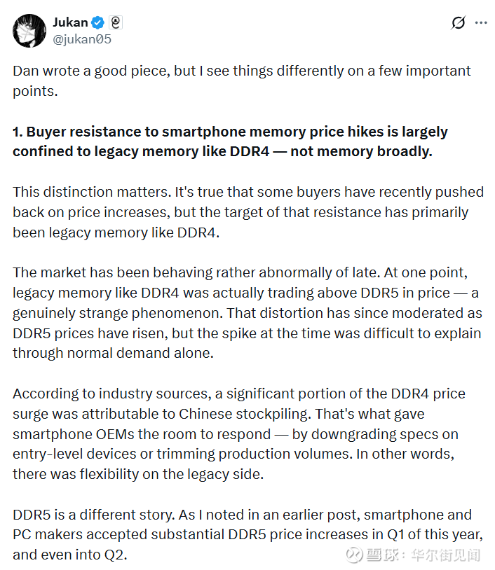 “但DDR5完全是另一回事。”Jukan指出。智能手机和PC制造商在今年一季度甚至二季度,都老老实实地接受了DDR5的大幅涨价。在当前的AI与高端设备生态中,DDR5不是一个可以讨价还价的谈判目标,而是买家即使支付溢价也必须确保的核心投入品。围绕DDR5构建的旗舰产品根本无法降低规格。
