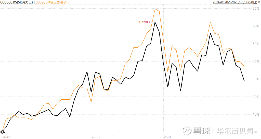SK海力士与三星电子合计占韩国综合股指权重近40%,两只股票遭外资大举抛售,成为此轮跌势的核心。