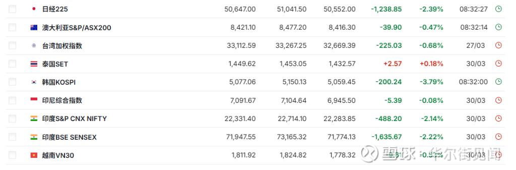 在油价飙升和地缘政治风险的双重打击下,亚太股市周二遭遇全面抛售。MSCI亚太指数日内下跌1%,连续第四个交易日走低,并抹去了2026年以来的所有涨幅,本月累计跌幅达13%,创下2008年10月以来的最差单月表现。