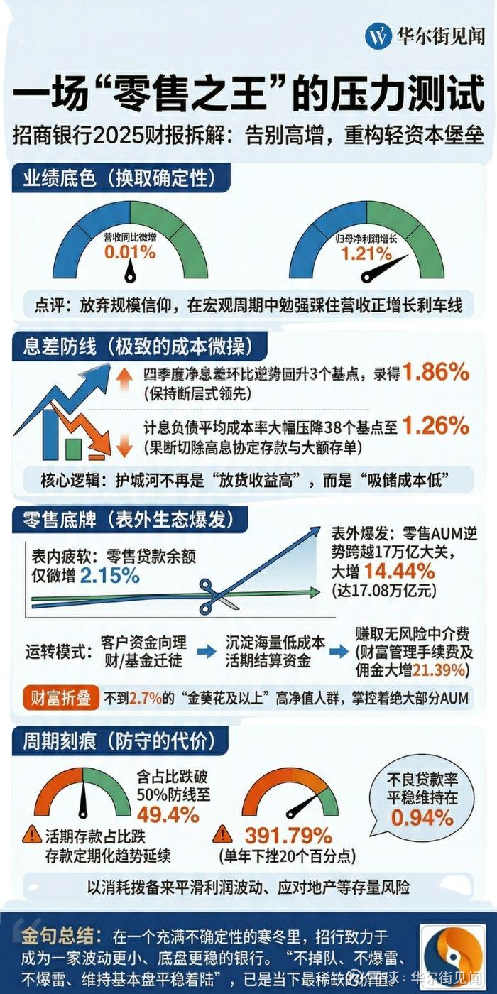 在规模信仰坍塌的宏观周期里,招商银行交出了一份“告别高增,换取确定”的答卷。2025年,招行营收同比微增0.01%、归母净利润增长1.21%;