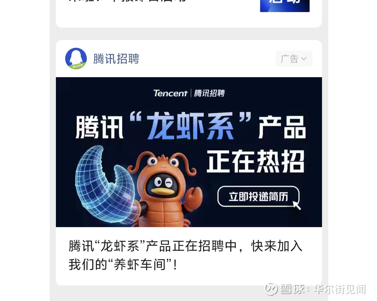 华尔街见闻发现,腾讯近日启动了“龙虾系”产品的大规模招聘,并在微信中大举投流推广。