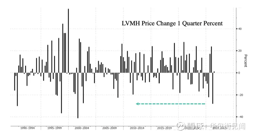 今年第一季度,LVMH股价28%的跌幅超过了新冠疫情期间以及2008年金融危机时的单季最大跌幅,但尚未超越2001年第三季度41%的历史极值。