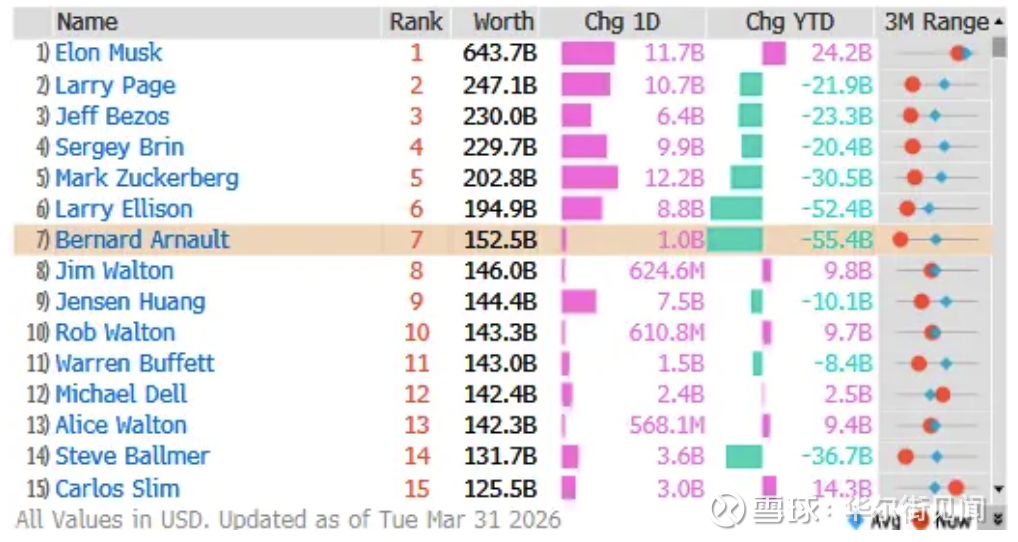LVMH首席执行官Bernard Arnault个人财富在过去一个季度蒸发约554亿美元,为全球500位最富有人士中缩水幅度最大者。