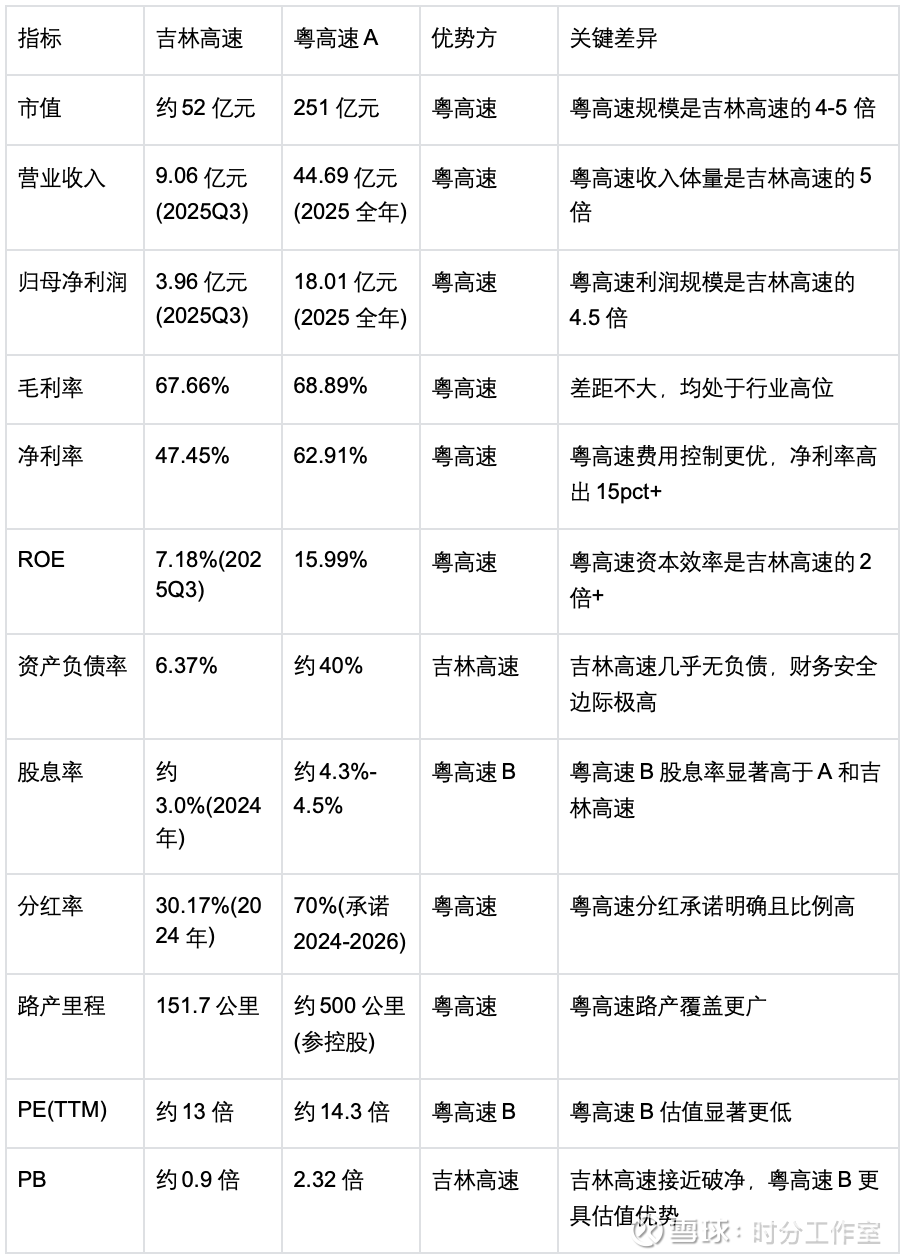 结论:粤高速$粤高速A(SZ000429)$ 更适合高股息、追求稳健增长的长期价值投资者,其核心优势在于:大湾区核心路产、70%高分红承诺、更高ROE;吉林高速$吉林高速(SH601518)$ 更适合极度保守、看重资产安全的防御型投资者,其亮点是:6.37%超低负债率、东北区域垄断,但分红率与成长性均较弱。