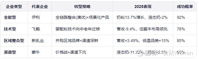 核心洞察:2025年中国乳业正经历从"产品竞争"到"生态竞争"的历史性跃迁。液态奶-16.8%的全渠道下滑与奶粉13.7%的增长反差,揭示了行业底层逻辑的重构:从"大众普及"转向"精准营养",从"渠道覆盖"转向"场景渗透",从"单品爆款"转向"解决方案"。在这场重构中,拥有全产业链控制力(11种关键原料100%自产)、技术迁移能力(8重HMO→1600+功能肽)和财务韧性(176亿现金储备)的企业将胜出,而单纯依赖规模或渠道的企业将面临价值重估。