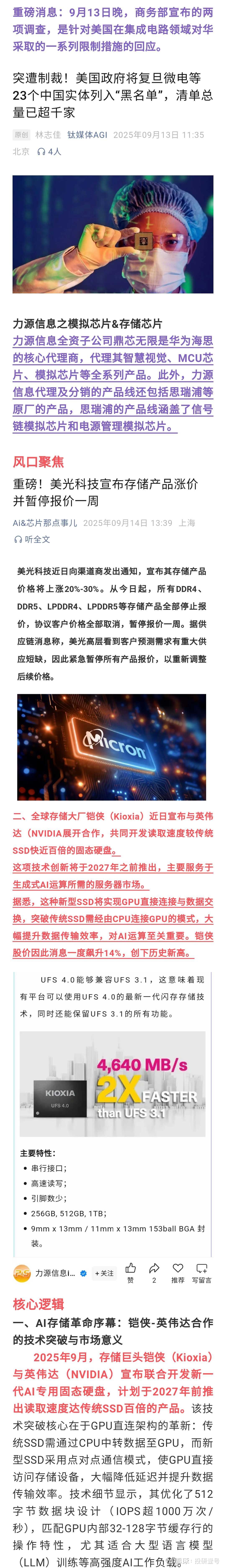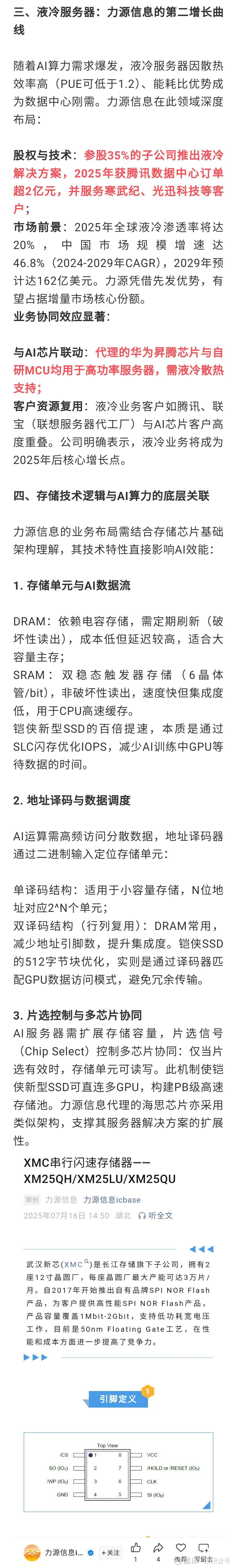 此合作直指生成式AI服务器的痛点——存储墙(Memory Wall)问题。当前AI算力增长受限于数据搬运效率,而铠侠的SLC XL-Flash存储器(读取延迟仅3-5微秒)结合英伟达的GPU协同设计,可将存储带宽提升至新量级,推动单机柜功率向50kW演进。市场层面,该技术将加速液冷服务器渗透(高功率密度需高效散热),并重构AI算力基础设施生态,为力源信息等布局AI芯片与液冷技术的企业创造协同机遇。