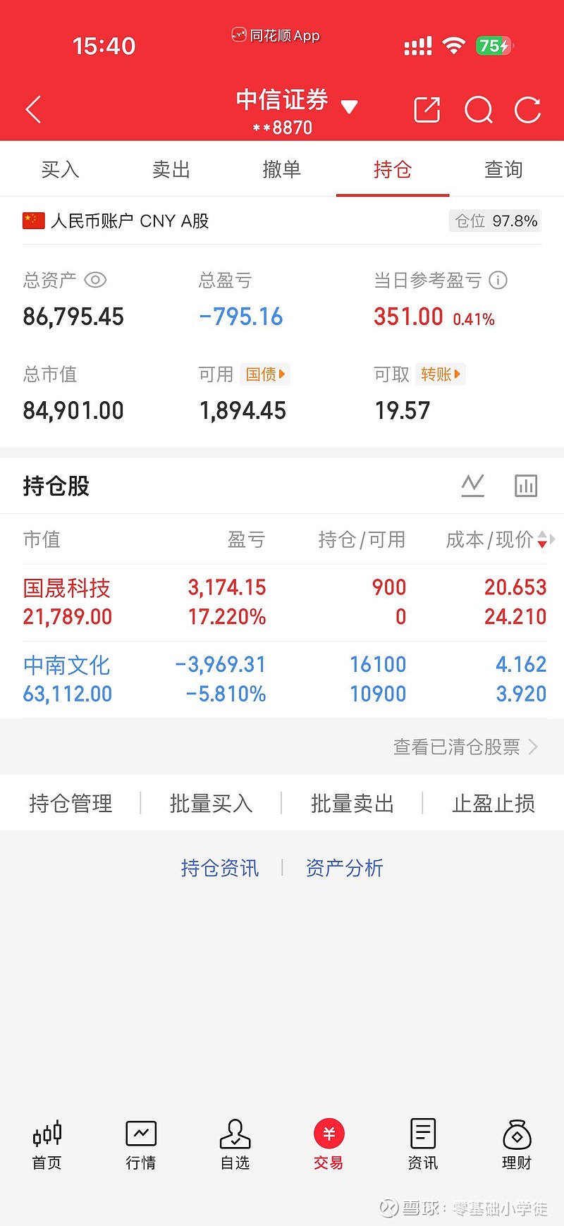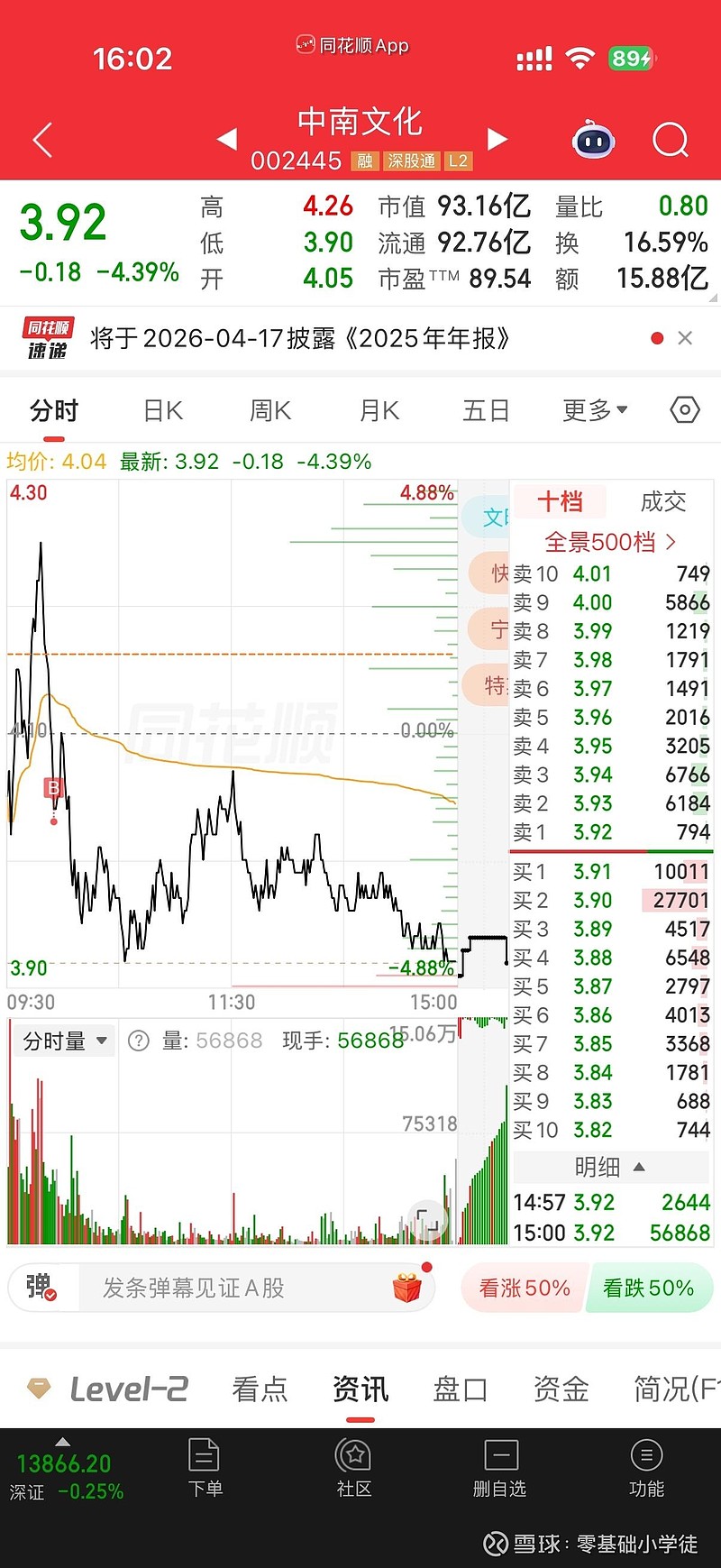 2、中南文化,前期走出了五个一字板,非常亮眼,为什么选择今天加仓,也是因为错杀,个人理解是错杀,今天缩量,盘中是有承接的,3.9附近磨了很久,有人砸,就有万手做支撑,虽然说跌破所谓的五日线,但是这不是绝对的,国晟前天跟昨天都是跌破五日线,股票没有绝对的技巧,指数都是后置的,不是前置,我也没走,在水下的时候加仓了,目前持仓6万多,准备做中长线,反复T,这个股前面涨的逻辑没有问题,拟购苏龙热电,江阴的国资,我没去过江阴,但我知道那里人有钱,有做生意的头脑,个人认为中南文化今年至少会有3-5倍的空间,股价12-18直接,才符合,当然需要看后期的收购,收购重组成功,第二个锋龙也是有可能的。