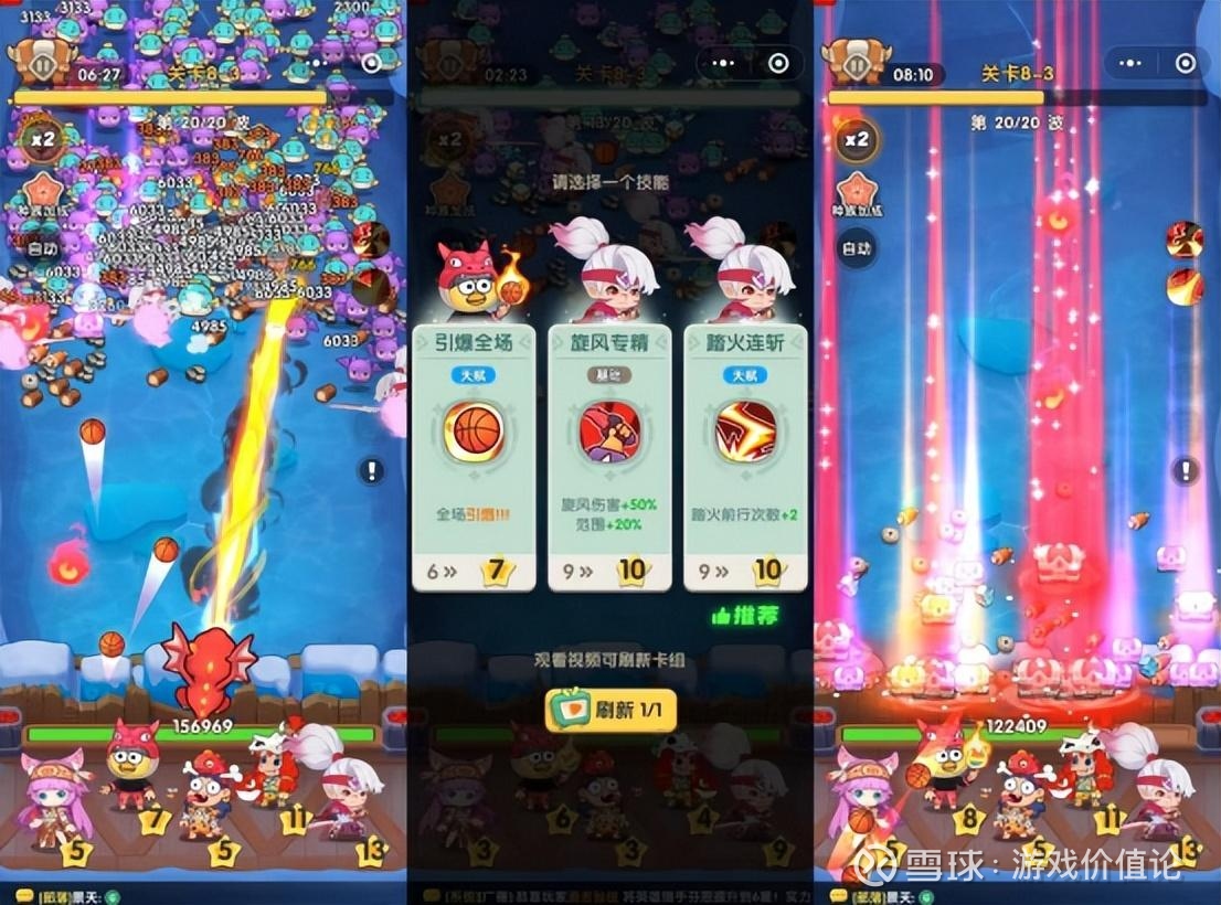 通过上面的介绍,是不是有一种熟悉感?是的,将塔防玩法换成放置战斗,这款游戏也就成了放置类。这也是目前小游戏的一种主流的玩法融合,即用一种有趣的玩法+放置类养成体系(很多是类《咸鱼之王》的养成体系)。年初爆火的《冒险者日记》(又名《卡皮巴拉Go!》)和《保卫向日葵》,最近表现不错的《全境守卫》和《超能下蛋鸭》都是这种思路。