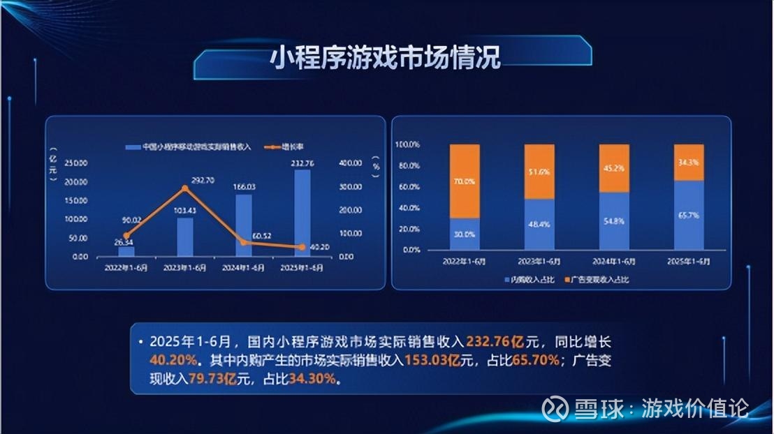 而小程序游戏市场则是中国游戏产业增长最快的市场,7月31日游戏工委发布的《2025年1-6月中国游戏产业报告》显示,2025年1-6月,国内小程序游戏市场实际销售收入232.76亿元,同比增长40.2%。经历了前两年的爆发式增长,小游戏仍处于较快增长的阶段。