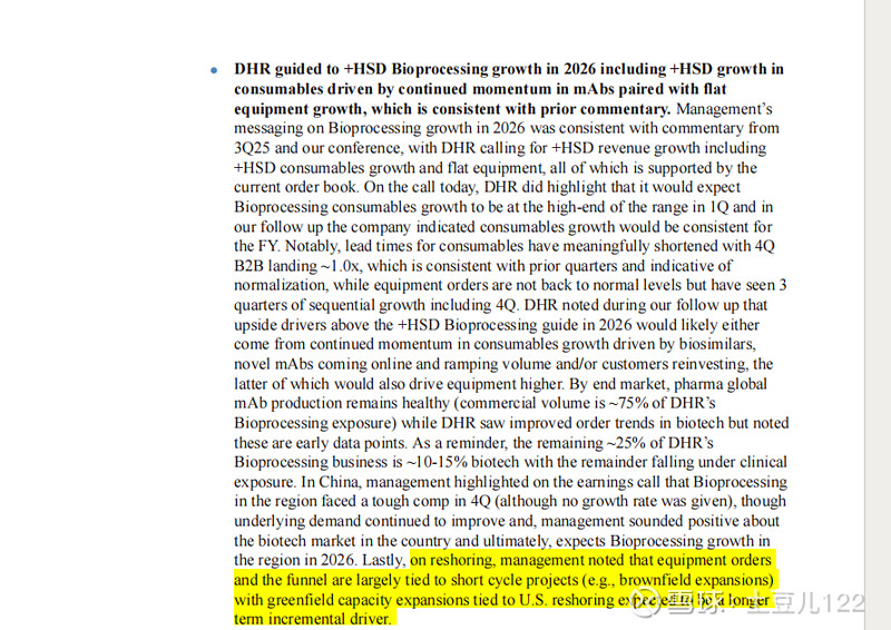 $森松国际(02155)$ DHR依然维持月初JPM年会给的指引,2026年大概是3-6%的增长,其中生物加工bioprocessing是给了HSD增长指引,这个是有订单支撑,而且Q4设备收入转正了。关于业务回流,管理层强调设备订单及订单漏斗主要集中在周期性项目(如棕地扩建),而与美国业务回流相关的绿地产能扩张预计将成为长期增量增长点。