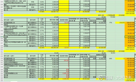如果以上财务四表判断是可进入自选股则表0必须做,否则就打住,同花顺只能查最近5期(1年多,现在基金运作股票至少2-3年),20年上市公司至少化10小时完成数据,主要是要下载各期季报年报PDF,从中将股东列表转换EXCEL,看上去没意义,但结合分析当年当季K线增发解禁,大股东行为,股东人数,计算各类股东参与成本,有积极意义。只能上传2季就占满屏幕,总之说明一下,能看到控股大股东从2013至今的持股变化和当季市值占比: