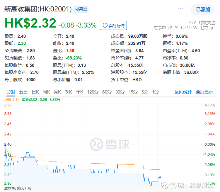 中报发出后,截至5月29日,新高教集团的股价一度下跌3.33%至2.32港元/股。