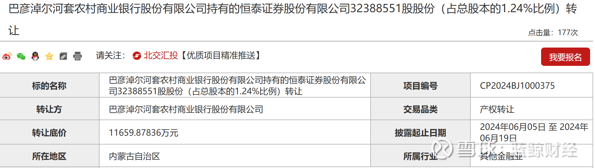 6月5日,北京产权交易所显示,巴彦淖尔河套农村商业银行股份有限公司(下称“巴彦淖尔河套农商行”)拟将持有的恒泰证券股份有限公司(下称“恒泰证券”或恒投证券,1476.HK)3238.86万股股份(占其总股本的1.24%)挂牌转让,转让底价为11659.88万元,挂牌披露起止日期为2024年6月5日至2024年6月19日。