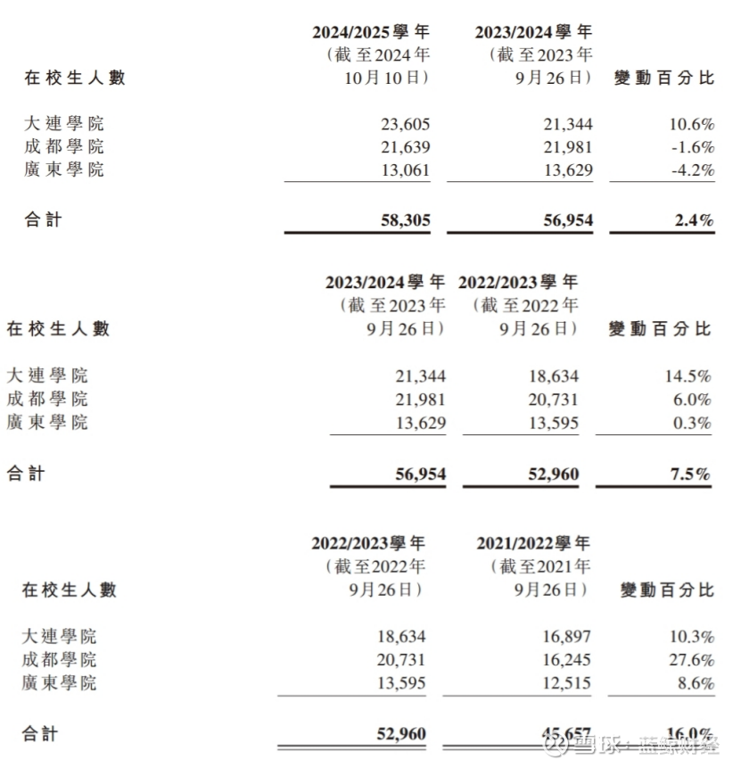 公告显示,三所大学新生人数从2023/2024学年的18056人增长至2024/2025学年的18294人,增长约1.3%。但公告中也明确提示,由于校园容量的限制,成都学院与广东学院于2024/2025学年的在校生人数有小幅下降,但三所大学在校生人数整体上依旧保持增长,目前三所大学综合校园利用率达到约96.2%——已经非常饱和,目前的学生容量已经基本达到临界值。