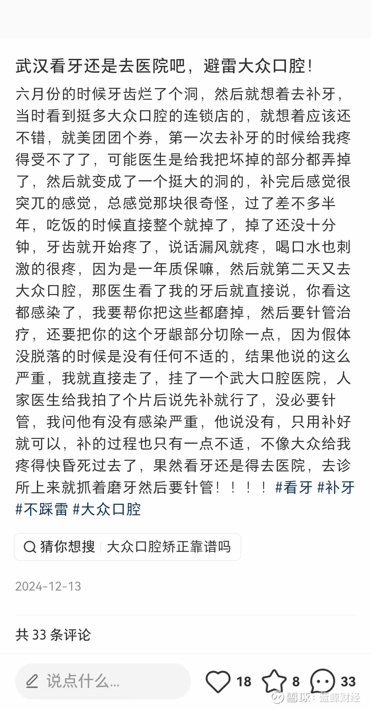 公立医院的专家资源和专业度或许是让患者更愿意选择的关键因素。事实上,蓝鲸新闻发现在社交平台上,多位患者对大众口腔的服务产生不满,反映问题包括过度医疗和治疗过程中更换医生等。