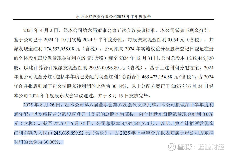 东兴证券还同步释出中期分红计划,拟以总股本为基数,向全体股东每股派发现金红利0.076元(含税),合计拟派发现金红利约2.46亿元,占上半年归母净利润的30%。后续公司制定2025年度利润分配方案时,将考虑已派发的半年度利润分配因素。