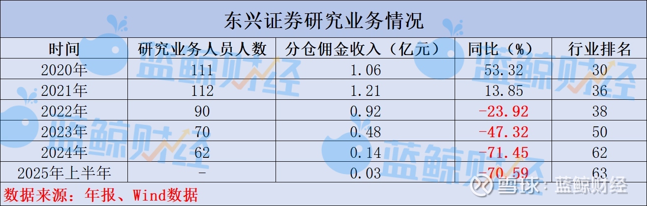 蓝鲸新闻9月12日讯(记者 陈晓娟)首席经济学家一职空缺6年后,东兴证券日前对外释出市场招聘计划,这也被行业视为其试图重振研究业务的重要动作。从现状来看,东兴证券研究所分仓佣金收入连年下滑,今年上半年仅0.03亿元,研究人员持续流失,已降至2020年的半数左右,显然压力不小。