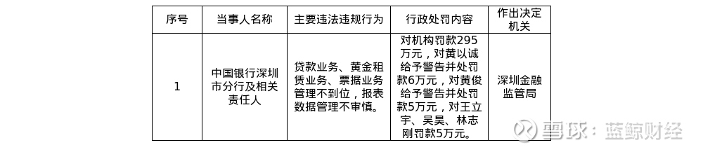 罚单显示,中国银行深圳市分行的主要违法违规行为行为是:贷款业务、黄金租赁业务、票据业务管理不到位,报表数据管理不审慎。