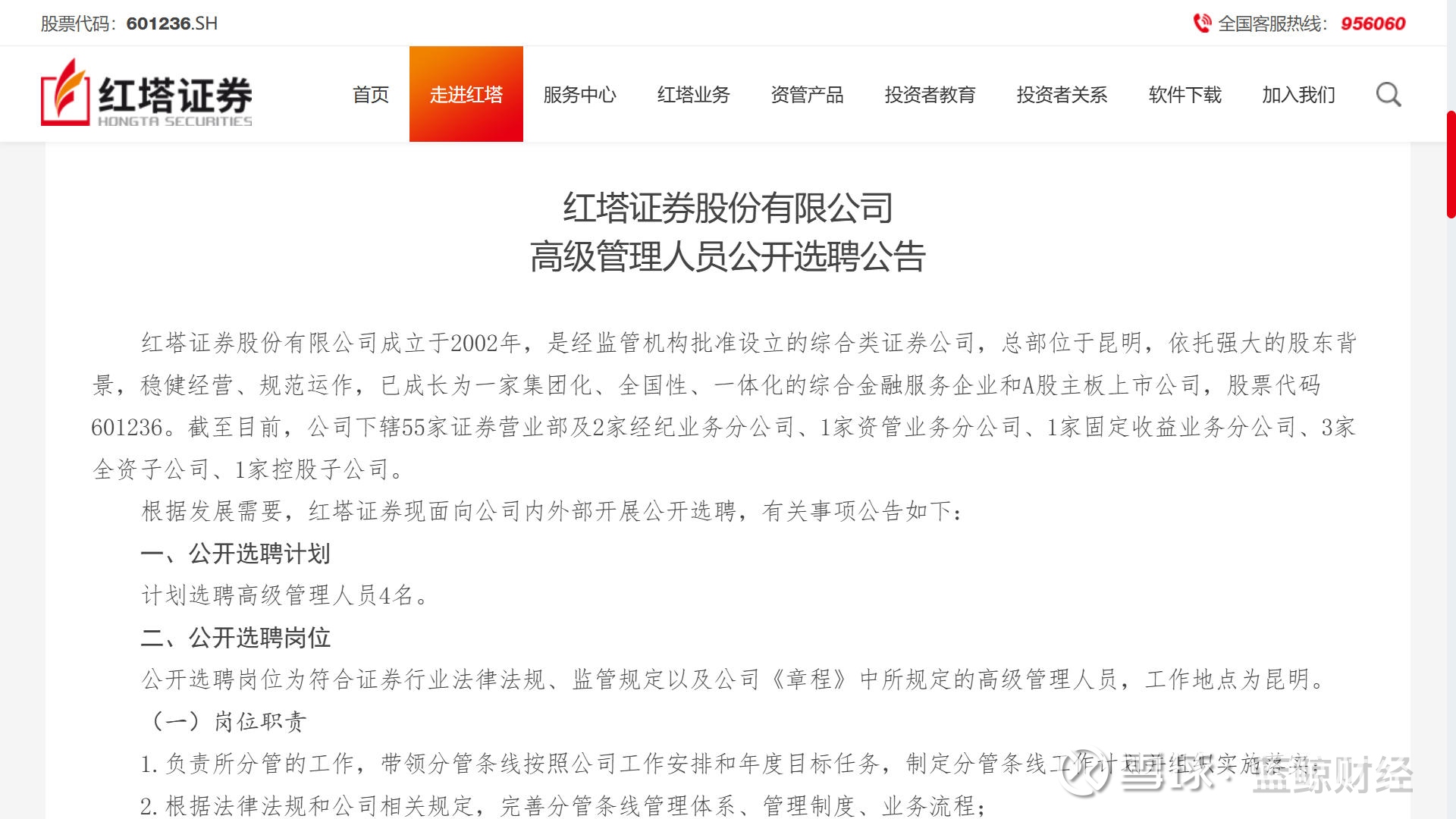 选聘公告显示,根据发展需要,红塔证券现面向公司内外部开展公开选聘,计划选聘高级管理人员4名,涉及副总裁、首席信息官、董事会秘书三个职位,工作地点均为昆明。基本条件方面要求年龄50周岁以下、符合行业选聘有关规定等。