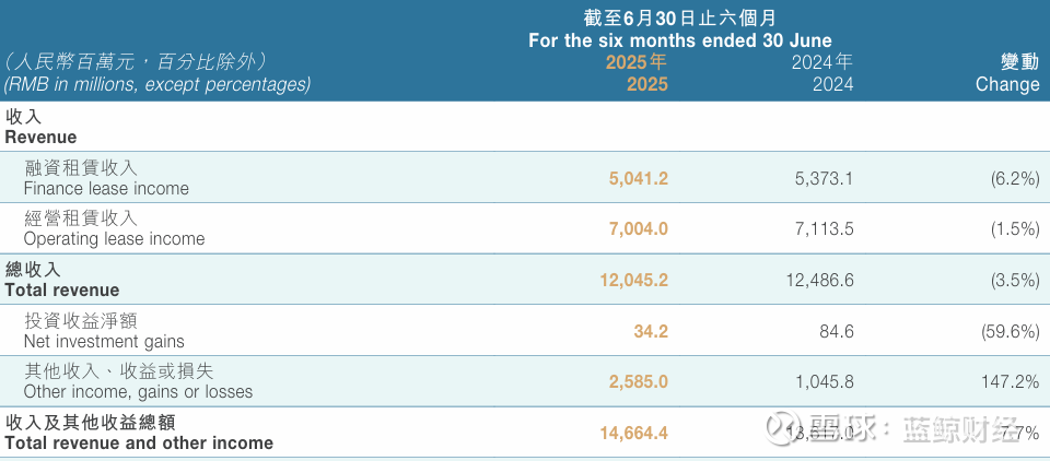 9月25日,国银金租发布了2025中期报告:2025年上半年,实现收入及其他收益总额146.64亿元,较上年同期上升7.7%;实现净利润24亿元,较上年同期上升27.6%,主要是由于2025年上半年集团主动压降流动性储备,加强资金成本管控,借款规模和利率下降,利息支出减少;同时积极争取飞机保险赔偿,加大资产处置力度,且汇兑收益上升,其他收入、收益增加。