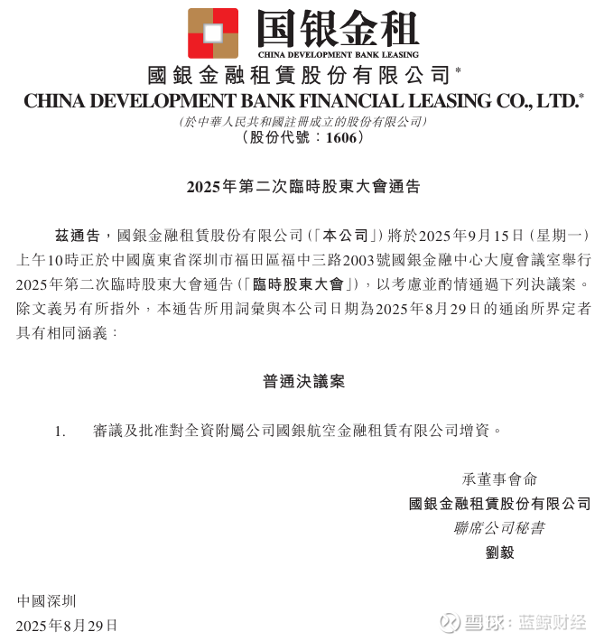 8月29日,国银金租因公告乌龙事件引发市场关注。当日16时许,公司通过港交所“披露易”连发三份公告,称拟以自有资金向全资子公司国银航空增资10亿美元,并计划于9月15日召开临时股东大会审议该议案。