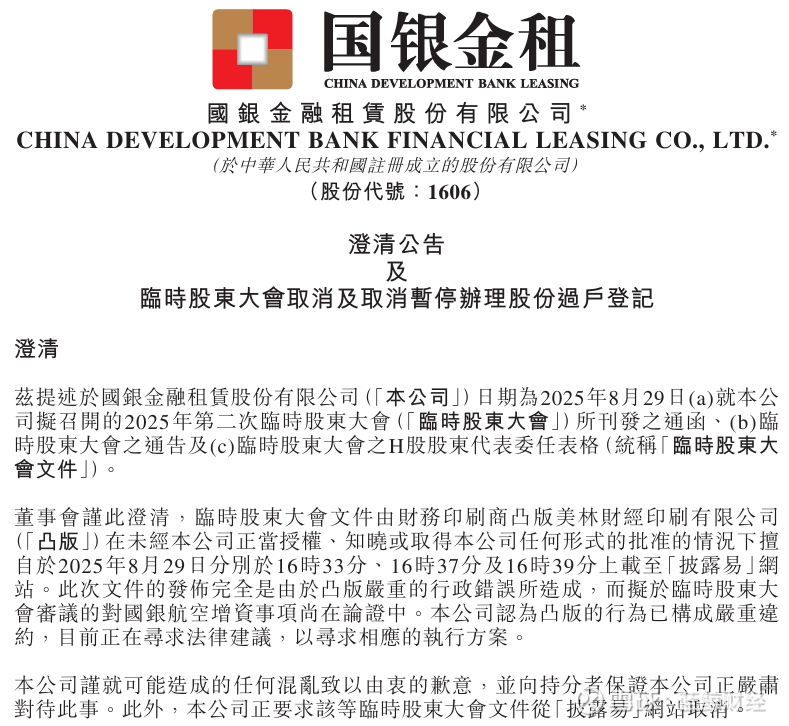 仅6小时后,公司发布澄清公告,指出上述公告系财经服务商凸版美林未经批准擅自发布,已构成严重违约,公司已启动法律追责程序;同时明确对国银航空的增资事项“尚在论证中”,取消原定于9月15日的临时股东大会。