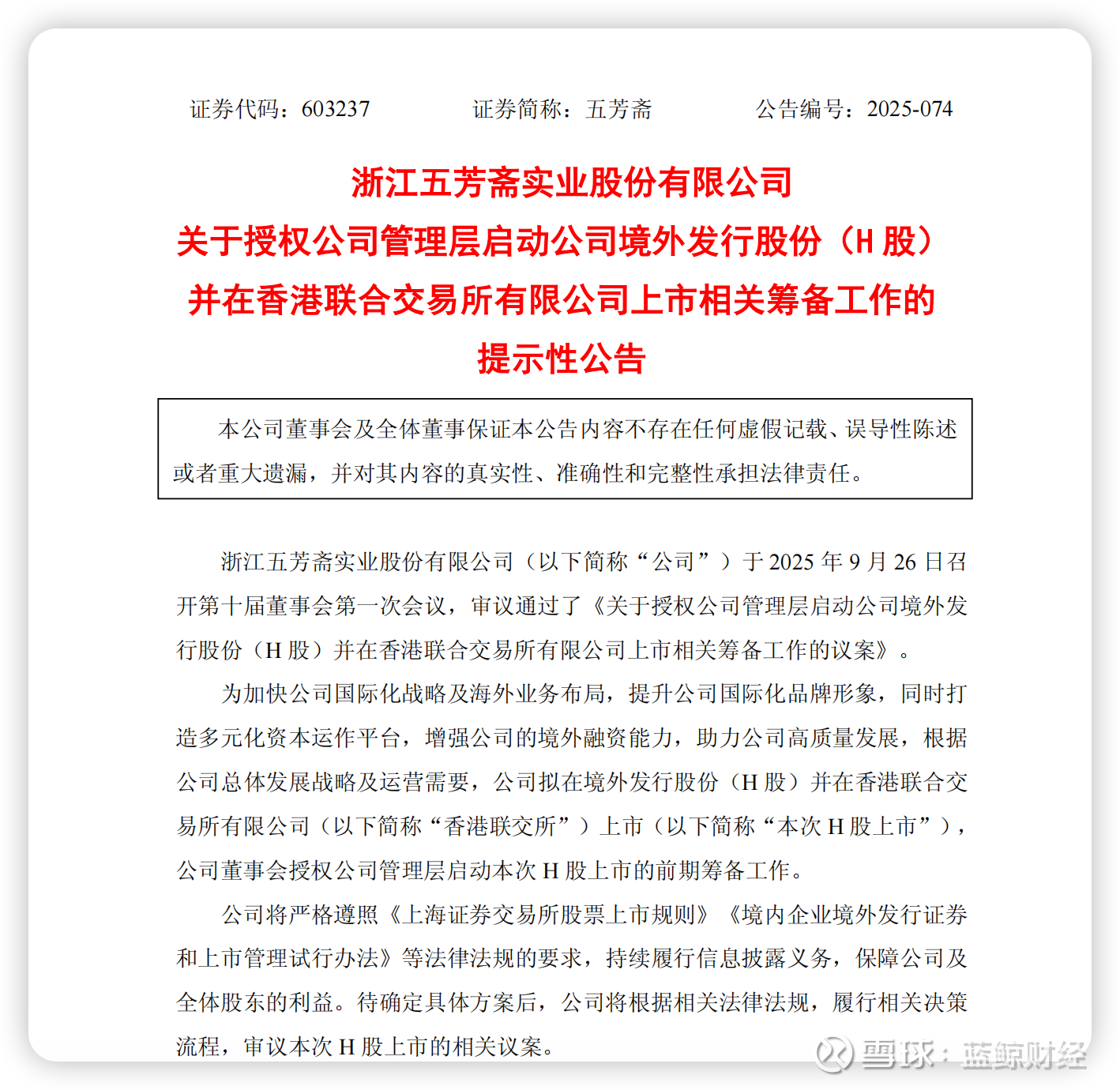 根据五芳斋9月26日发布的《关于授权公司管理层启动公司境外发行股份(H股)并在香港联合交易所有限公司上市相关筹备工作的提示性公告》,公司董事会已授权管理层启动H股上市的前期准备工作。