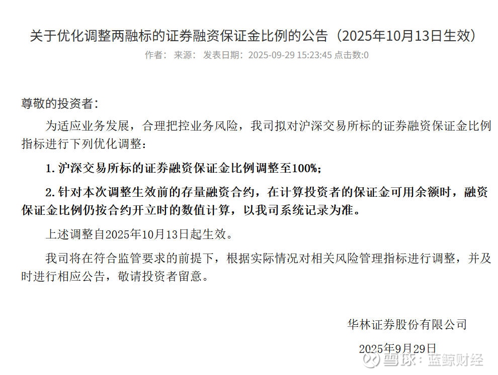 公告显示,为适应业务发展,合理把控业务风险,华林证券对沪深交易所标的证券融资保证金比例指标进行优化调整。将沪深交易所标的证券融资保证金比例调整至100%;针对本次调整生效前的存量融资合约,在计算投资者的保证金可用余额时,融资保证金比例仍按合约开立时的数值计算。调整自2025年10月13日起生效。