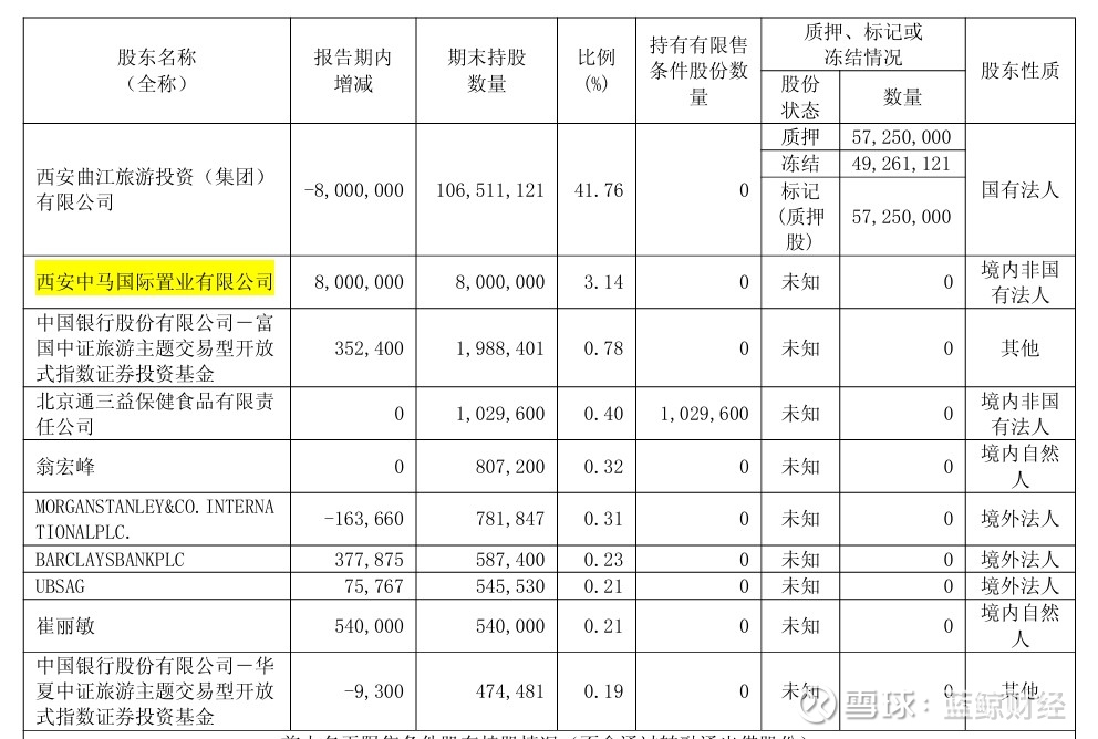 股票过户后,曲江文旅发布的2025年半年报中,控股股东西安曲江旅游投资集团持股比例从2024年底的44.9%下降至41.76%,西安中马国际置业则凭借3.14%股份一跃成为第二大股东。