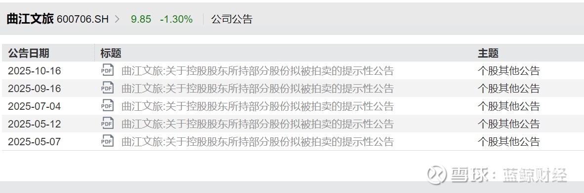 蓝鲸记者梳理发现,今年以来,曲江文旅五次发布股份拟被拍卖的提示性公告,从结果看,流拍、和解、成交等均有发生。