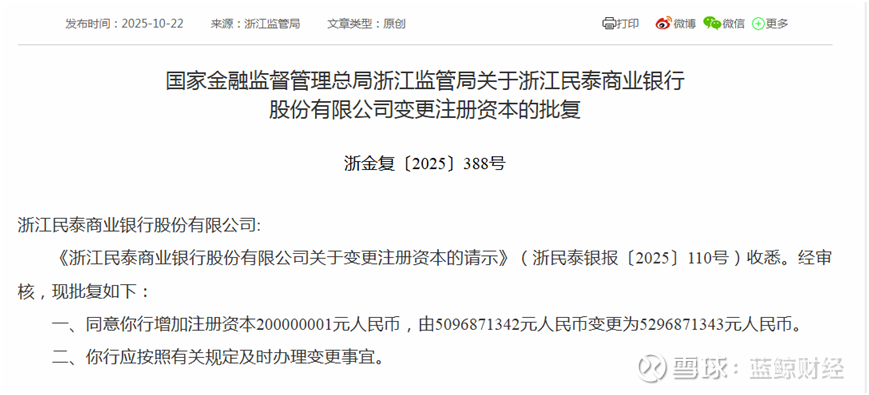 蓝鲸新闻10月23日讯(记者 金磊)10月22日,国家金融监督管理总局浙江监管局发布批复,同意浙江民泰商业银行(以下简称民泰银行)增加注册资本约2亿元,由约50.97亿元变更为约52.97亿元。