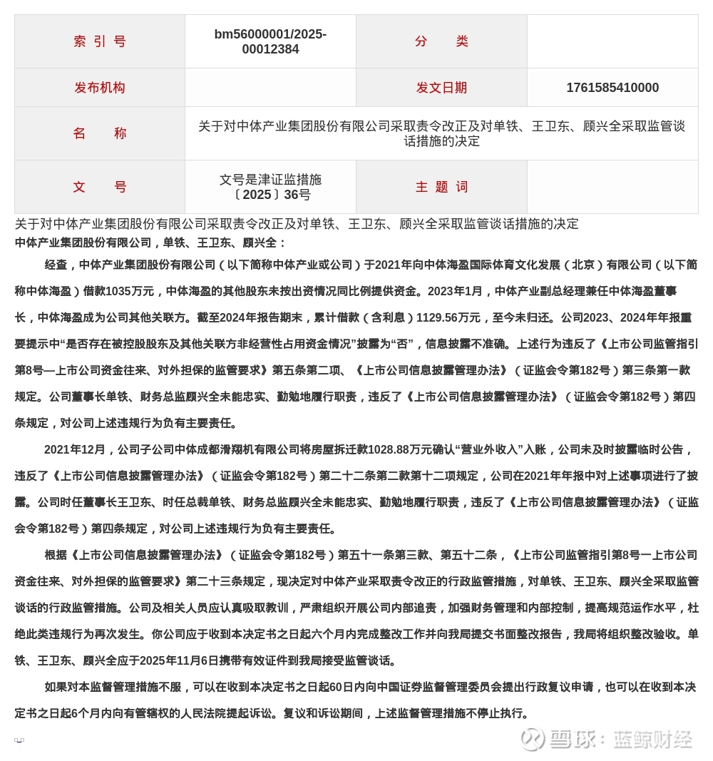 根据相关规定,天津证监局决定对中体产业集团采取责令改正的行政监管措施,对单铁、王卫东、顾兴全采取监管谈话的行政监管措施。