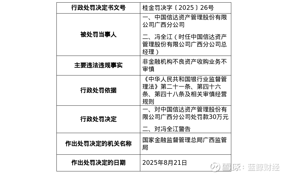 蓝鲸新闻11月17日讯,近日,国家金融监督管理总局广西监管分局发布了行政处罚决定书,剑指中国信达资产管理股份有限公司广西分公司及其相关责任人。