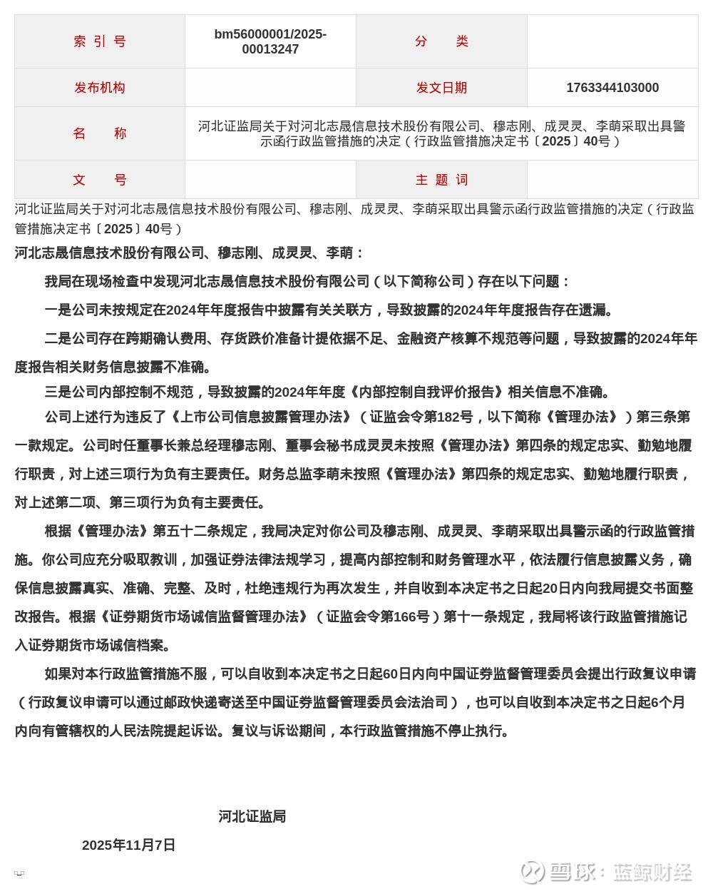 蓝鲸新闻11月17日讯,近日,河北证监局发布行政监管措施决定书,剑指河北志晟信息技术股份有限公司(以下简称公司)及相关责任人。