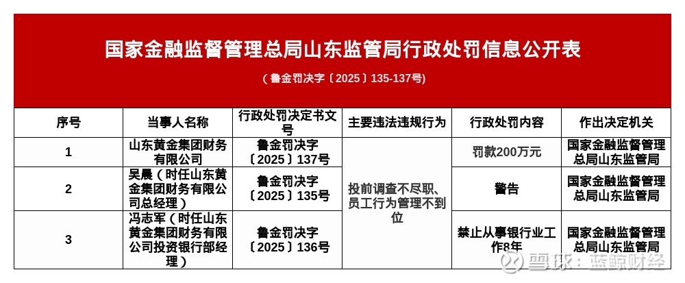 此外,时任山东黄金集团财务有限公司总经理吴晨被警告;时任山东黄金集团财务有限公司投资银行部经理冯志军被禁止从事银行业工作8年。