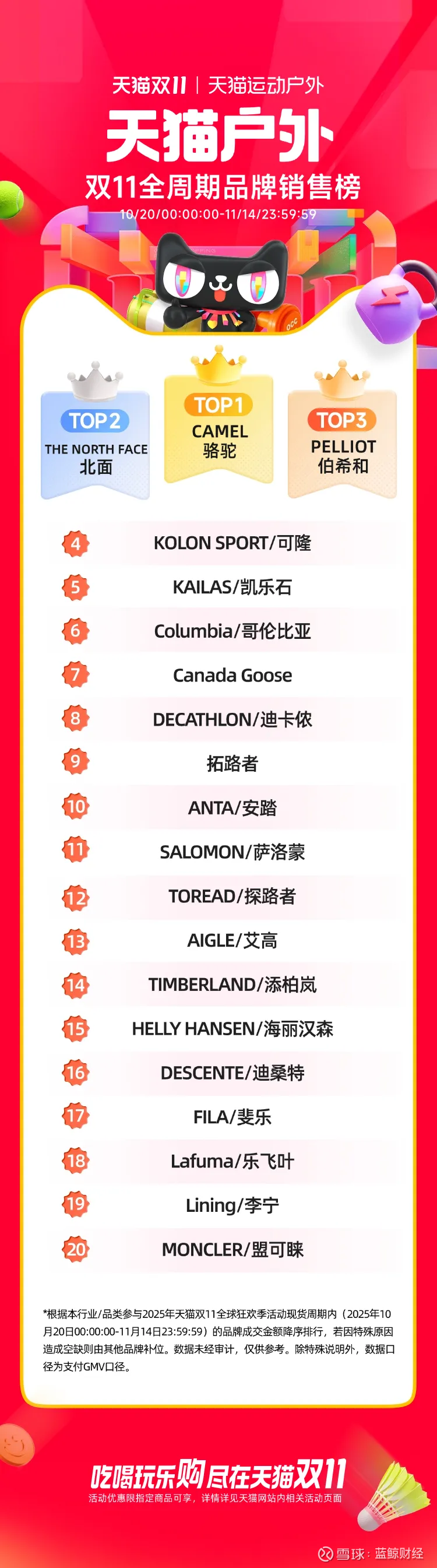 尽管如此,一些变化已经发生。天猫发布的双11户外销售榜显示,始祖鸟悄然跌出前二十。而国产品牌骆驼、伯希和、凯乐石等纷纷跻身榜单前列,户外消费市场格局生变。