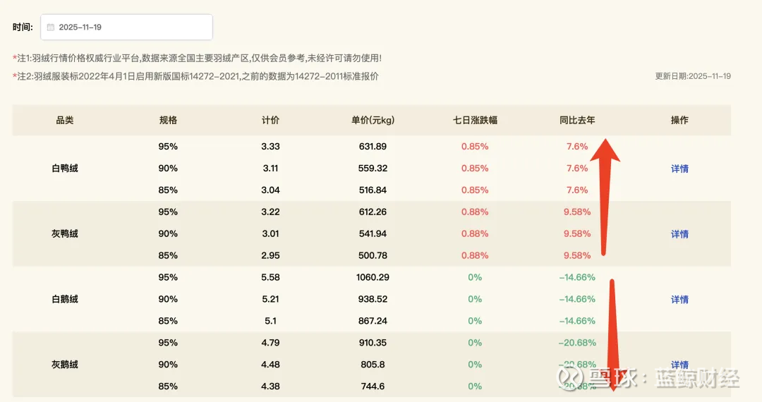 相比之下,价格更高的鹅绒反而比去年更便宜了,截至11月19日,含绒量95%的白鹅绒1060.29元/公斤,含绒量90%的白鹅绒938.52元/公斤,含绒量85%的白鹅绒867.24元/公斤,同比去年降价14.66%,灰鹅绒降幅更是高达20.68%。