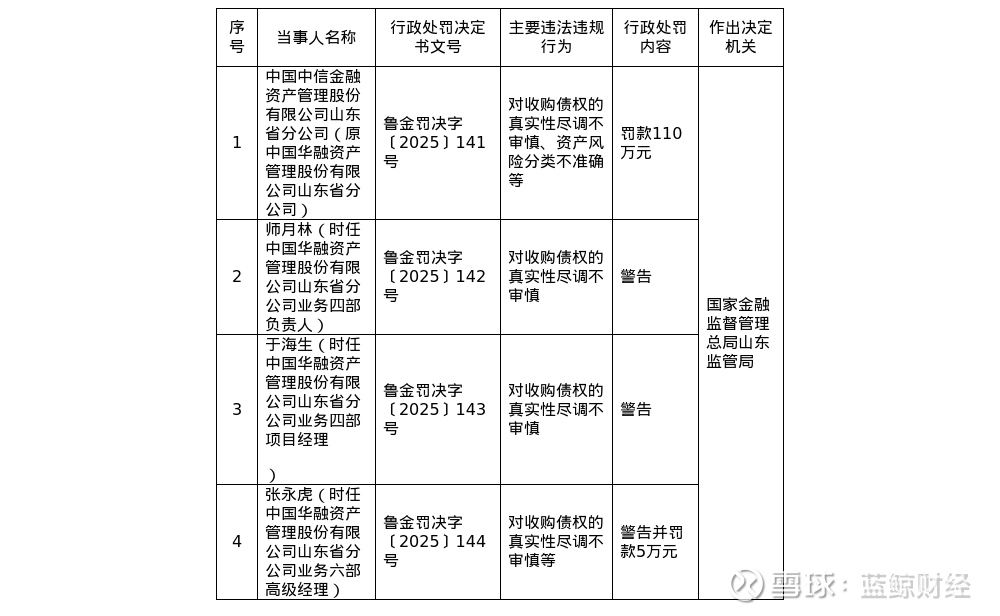蓝鲸新闻11月27日讯,近日,国家金融监督管理总局山东监管局发布了罚单,剑指中国中信金融资产管理股份有限公司山东省分公司(原中国华融资产管理股份有限公司山东省分公司)及其相关责任人。