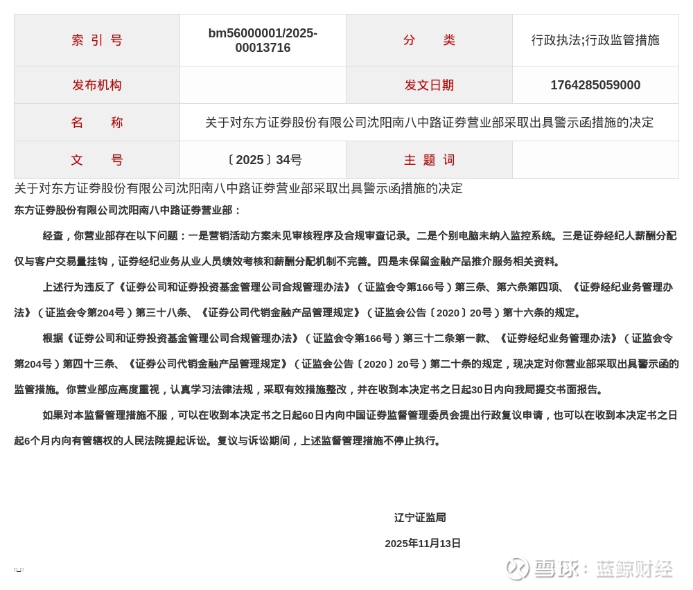 蓝鲸新闻11月28日讯,近日,辽宁证监局发布行政监管措施决定书,剑指东方证券股份有限公司沈阳南八中路证券营业部。