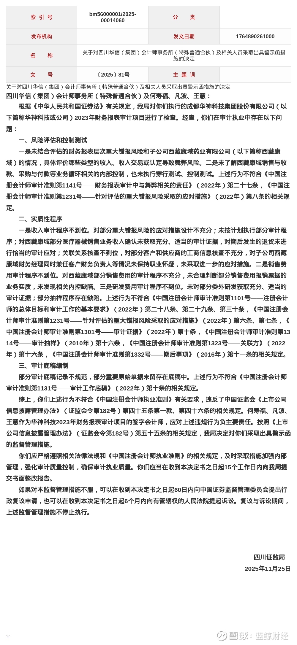 决定书显示,四川华信(集团)会计师事务所在成都华神科技集团股份有限公司2023年财务报表审计项目中存在以下问题: