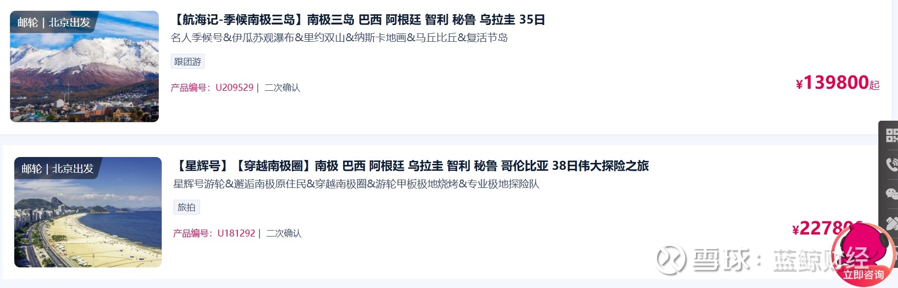 此外,有旅行社南极游产品界面显示“二次确认”标识,蓝鲸记者获悉,“二次确认”是指相关产品的库存需要进一步确认,可能已经售罄,或者部分产品来自此前完成购买,但因行程有变无法按时前往的游客的退票,在预订时,游客需要和旅行社再次确认。