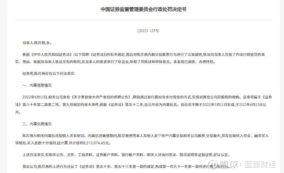 其中,陈芹燕存在以下违法事实:经查明,2022年6月13日,相关公司发布《关于筹划重大资产重组的停牌公告》,称拟通过发行股份及支付现金的方式,实现对其他公司控股权的收购。陈芹燕与相关内幕信息知情人关系密切。内幕信息敏感期内,陈芹燕使用本人及他人多个账户内幕交易相关公司股票,交易额大,并存在新转入资金、融资买入等情形,买入意愿十分强烈,经计算,共计获利821.4万元。