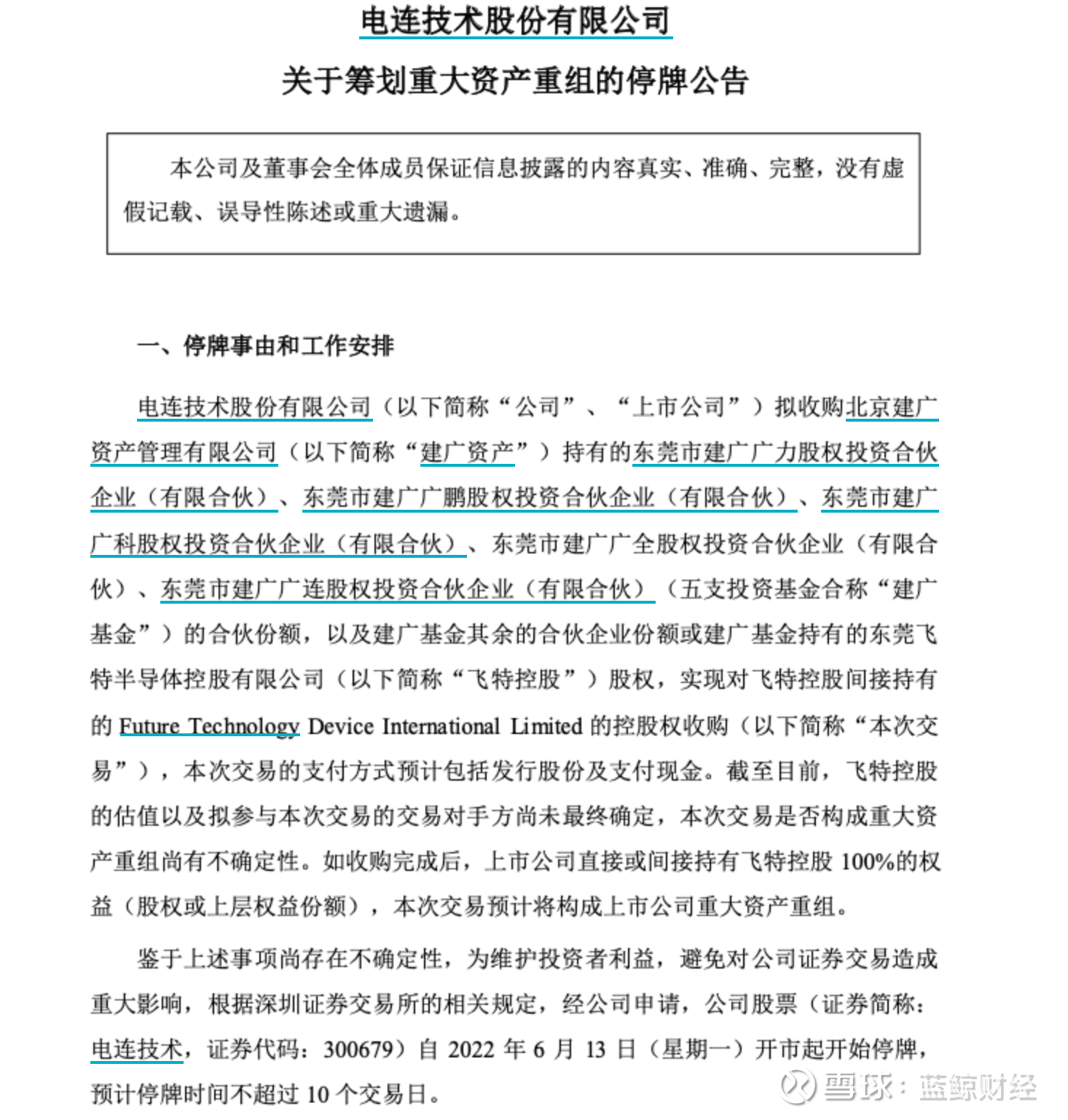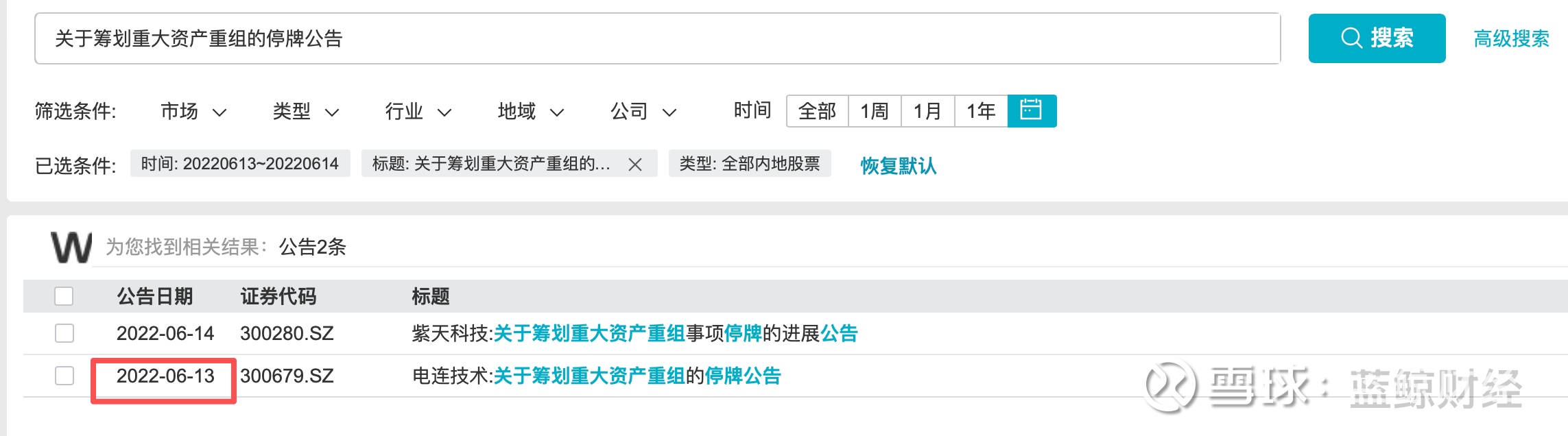 记者查询发现,根据Wind和巨潮资讯信息,2022年6月13日当日,市场仅有电连技术(300679.SZ)发布《关于筹划重大资产重组的停牌公告》。