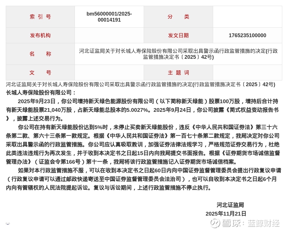 决定书指出,长城人寿保险股份有限公司于2025年9月23日增持新天绿色能源股份有限公司股票100万股,增持后合计持有新天绿能股票21,040万股,占新天绿能总股本的5.0027%。2025年9月24日,该公司披露《简式权益变动报告书》,披露上述交易行为。