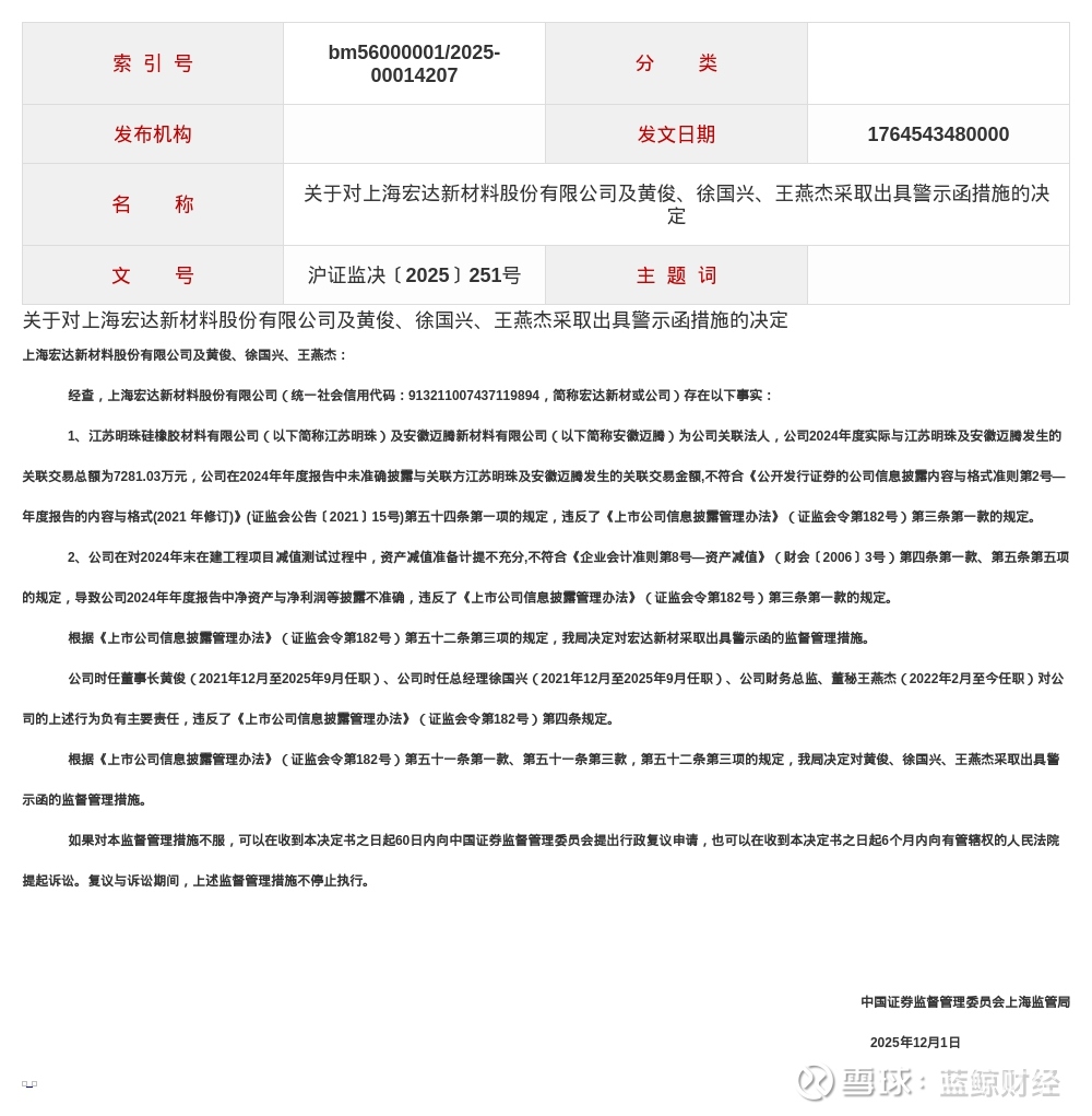 蓝鲸新闻12月9日讯,近日,中国证券监督管理委员会上海监管局发布行政监管措施决定书,剑指上海宏达新材料股份有限公司及黄俊、徐国兴、王燕杰。