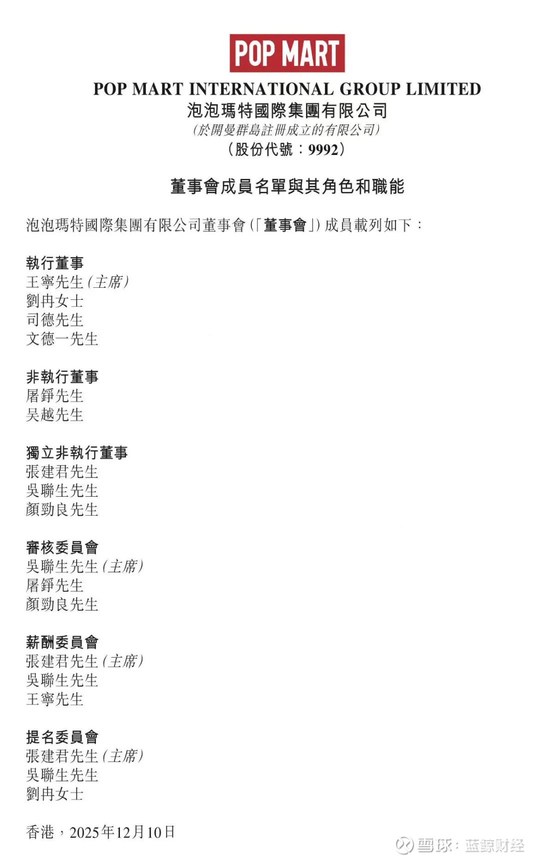 蓝鲸新闻12月10日讯(记者 汤诗韵)12月10日,泡泡玛特发布公告称,吴越先生已获委任为公司非执行董事,自2025年12月10日起生效。