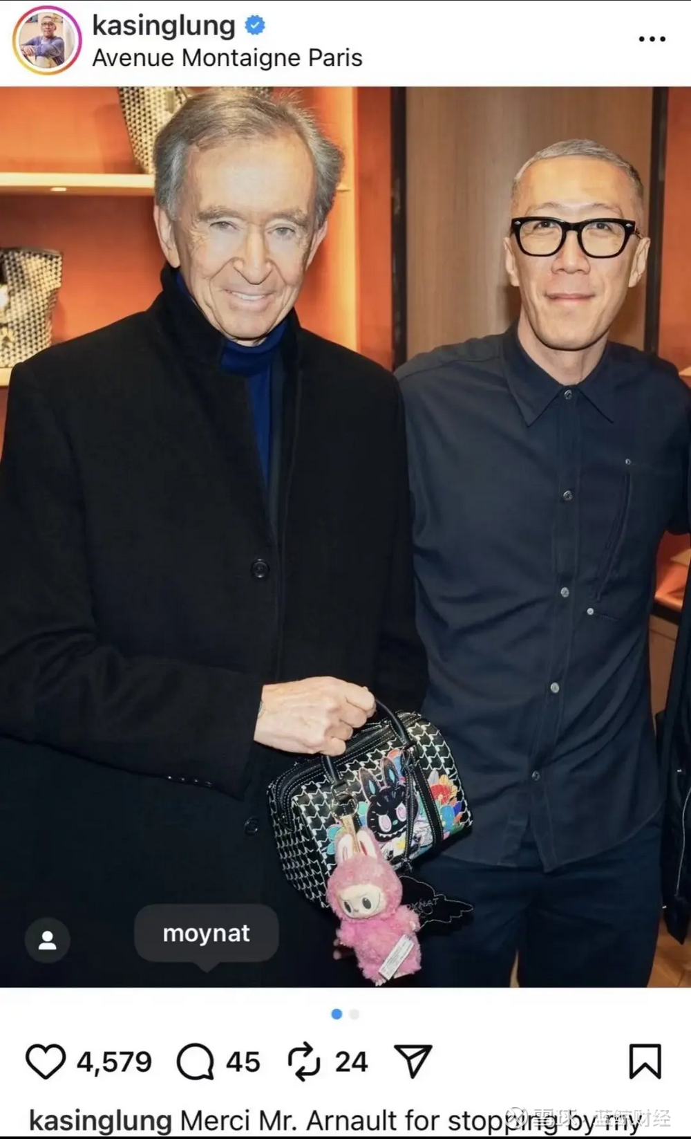 LVMH高层进入泡泡玛特决策层,这一变动或为双方潜在合作铺路。实际上,两家公司此前就有过交集。LVMH旗下奢侈品牌MOYNAT在今年10月推出了和Labubu之父龙家升独家联名的包袋系列。LVMH董事长兼CEO Bernard Arnault 现身MOYNAT新店,与龙家升同框亮相,足见对该合作的重视。