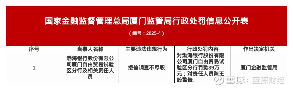 蓝鲸新闻12月12日讯,近日,国家金融监督管理总局厦门监管分局发布了一则行政处罚信息,剑指渤海银行股份有限公司厦门自由贸易试验区分行及其相关责任人。